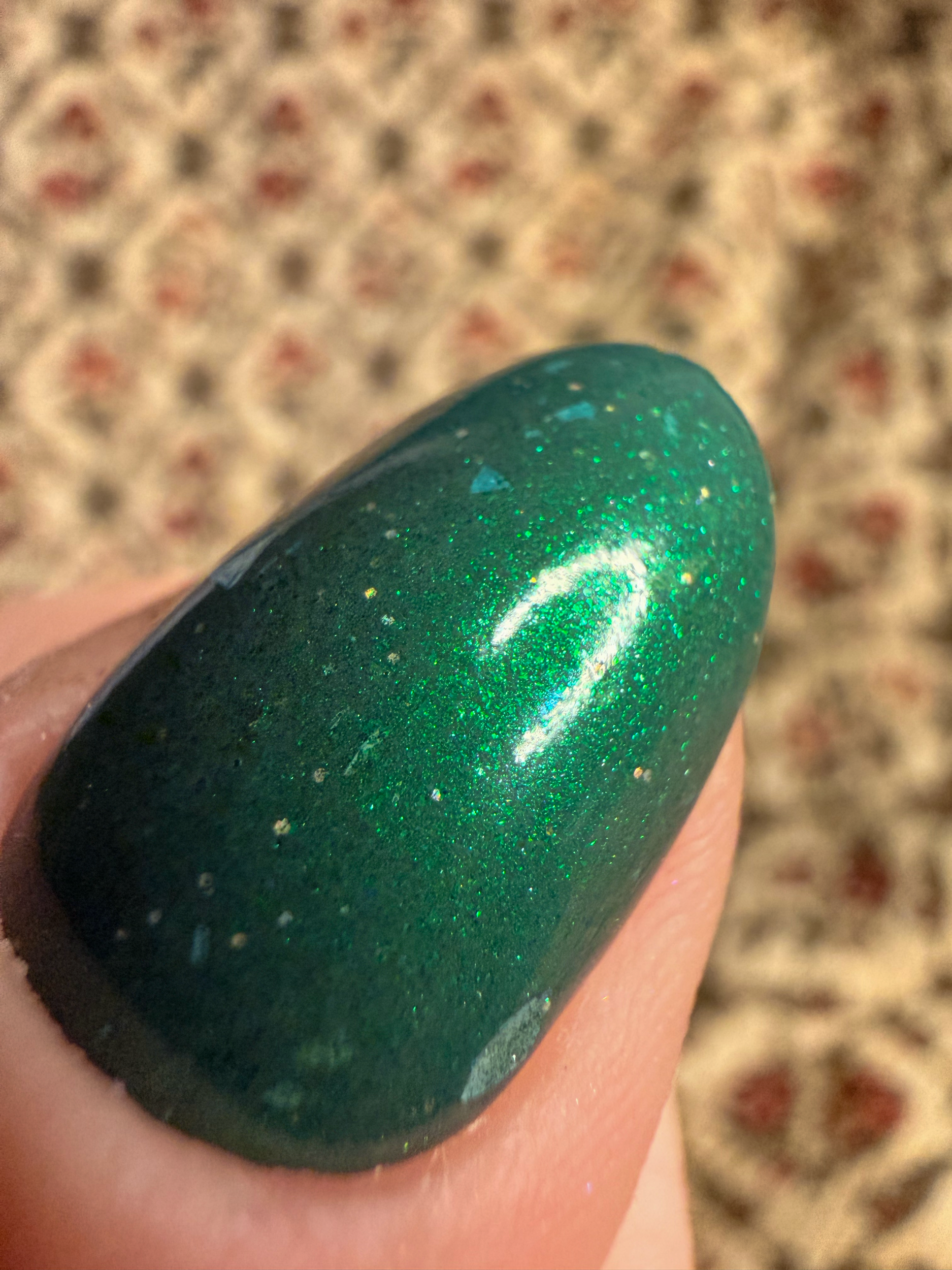 Green means go is a blue-green nail polish with a vivid green glow, scattered iridescent flakes, and a touch of holographic sparkle. The base leans cool and aquatic, while the glowing green shimmer cuts through with an almost electric intensity. Iridescent flakes catch the light in shifting flashes, adding depth and movement, while subtle holo adds a fine, scattered sparkle. Bright, bold, and impossible to ignore—this shade doesn’t hesitate.